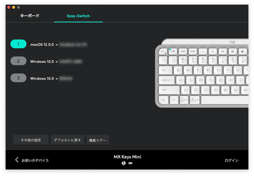 | Logi Optionsでの表示 ペアリングした切り替え先のPC名も自動で表示してくれる |